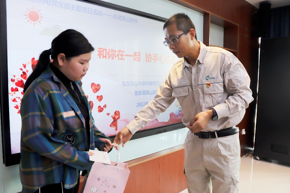 2022年8月15日,如东热电首次走进宾山初中,开展“和你在一起·协手心连鑫”爱心助学活动。如东热电与周边宾山初级中学结队,精准识别李顾彤、蔡欣彤两名贫困学生,公司党支部书记、工会主席马敬波向两名资助对象捐赠了助学金和学习用品,电力技术人员还义务为学校排查配电安全隐患。志愿者们持续关注资助对象,当得知李顾彤家用电异常,冒雨上门检修线路、宣传安全用电知识,用专业守护温暖。