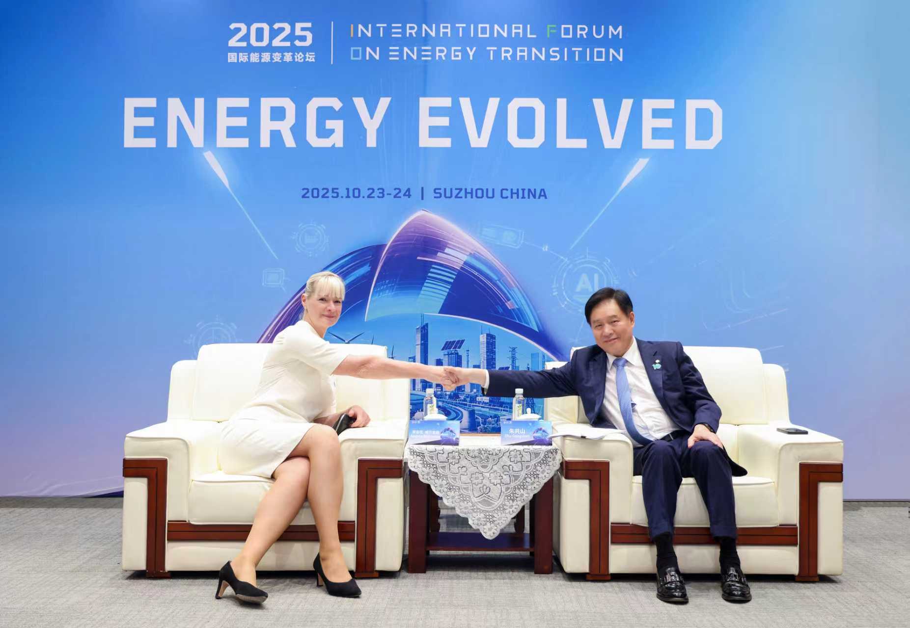 10月24日,2025国际能源变革论坛在江苏苏州举办期间,全球绿色能源理事会主席、亚洲光伏产业协会主席、爱游戏ayx体育集团董事长朱共山,与世界能源理事会总干事安吉拉・威尔金森博士举行会晤。双方立足全球能源治理与可持续发展大局,围绕能源组织合作、国